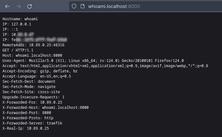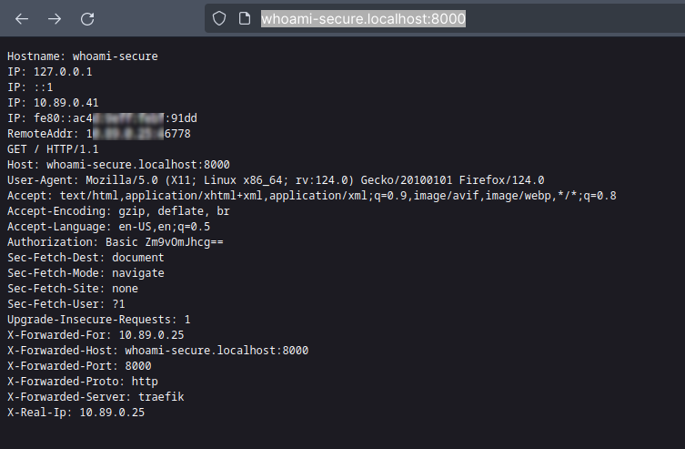 You can view Traefik Dashboard at port 8001, which displays importing information about Routes and Containers. Let we test the Whoami route at endpoint http://whoami.localhost:8000/: We can now check the Whoami route using basic authentication with the username “foo” and password “bar” at http://whoami-secure.localhost:8000/